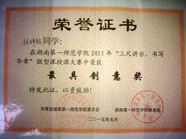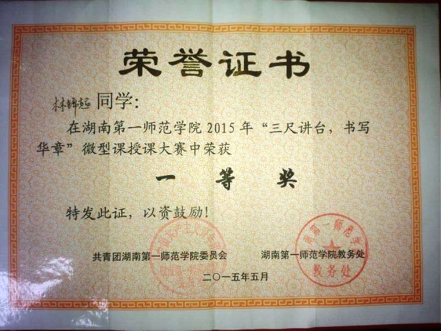 为进一步增强师范生实践运用能力与创新能力,彰显师范特色,强化学生教学技能,2015月5月19日晚,由校教务处主办、校团委具体承办的一年一度的微型赛课在文科楼报告厅圆满落幕。信息科学与工程学院教育技术学专业(小学教育)637班林锦超同学在班导师张玲老师的指导下仔细选题、精心备课,认真上课,充分运用信息技术手段凭借幽默创新、智慧高效的课堂获得在场评委以及观众的一致好评,从决赛的8位学生中脱颖而出,以92.8的高分荣获全校一等奖及最具创意奖。