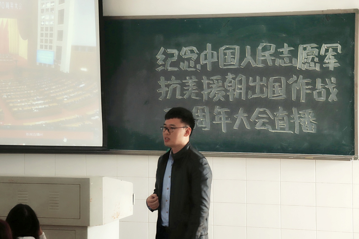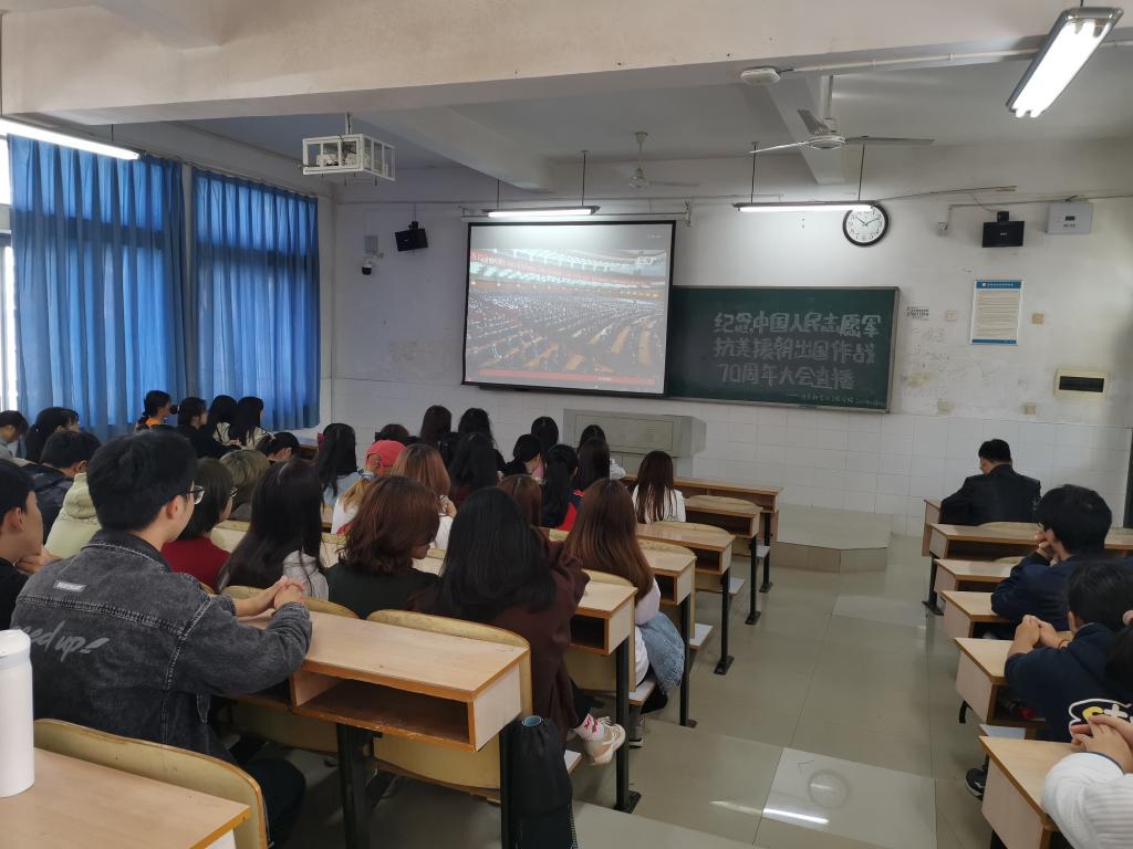 组织师生代表收看纪念中国人民志愿军抗美援朝出国作战70周年大会,聆听习近平总书记的重要讲话,缅怀为保家卫国牺牲的革命先烈,弘扬爱国主义与国际正义。