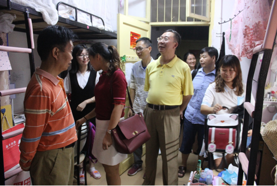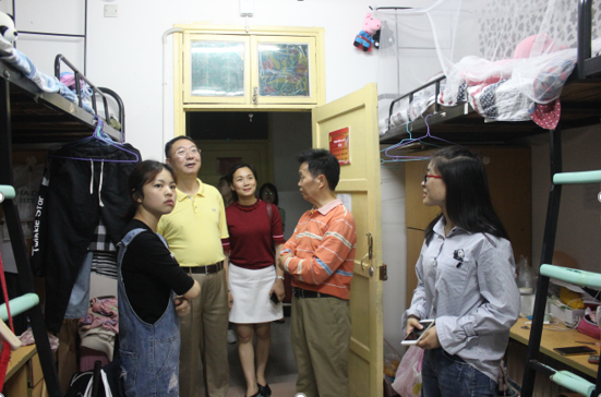 (通讯员 罗德琳 肖丽菲)6月3日晚,校长助理、信息科学与工程学院院长李勇帆、学院党总支书记王杰文、党总支副书记易利一行深入学生宿舍,检查宿舍设施卫生情况,走访关爱2018届毕业生。教育技术学教研室主任彭剑、学工办老师关红儒、唐瑞鸿陪同走访。