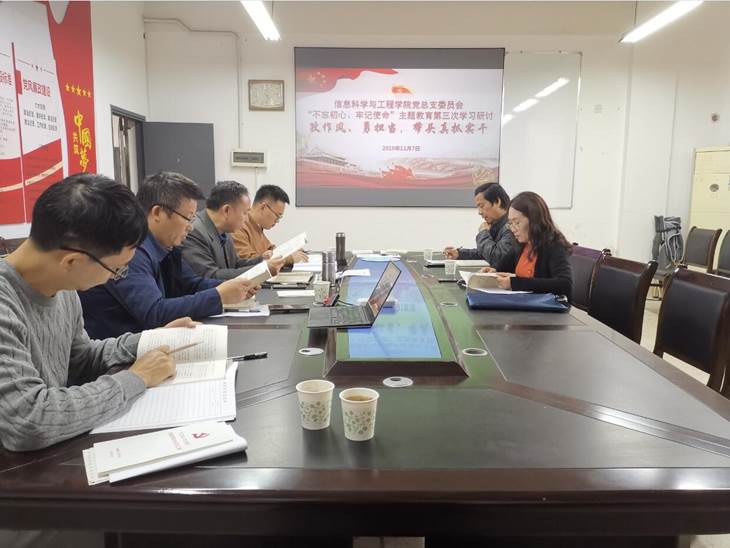 党总支委员在玉衡楼北栋407召开主题教育第三阶段“改作风、勇担当,带头真抓实干”集中学习研讨会。学校党委主题教育巡回指导组谭玉兰、张建国莅临指导。会议由学院党总支书记王杰文主持。