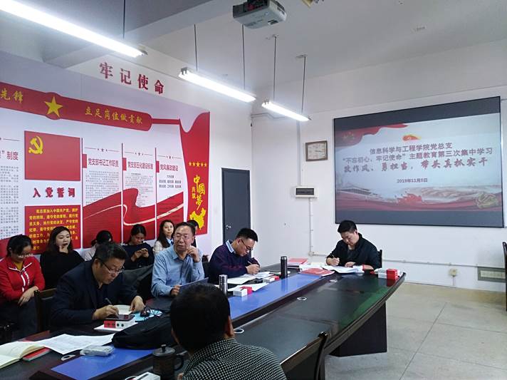 11月5日15时,信息科学与工程学院党总支部“不忘初心、牢记使命”主题教育第三次集中学习活动在玉衡楼北407举行。首先,党总支书记王杰文同志强调各党支部要结合“五化建设”,认真落实主题学习各项要求,组织党员对照党章党规按照“十八个是否”找准差距,检视问题,积极整改。随后,党总支副书记成夏炎同志围绕 “改作风、勇担当,带头真抓实干”作了主题发言,强调作为一名高校教育工作者,我们的初心与使命就是立德树人,为党育才,为国育人,也就是为培养中国特色社会主义的合格建设者和可靠接班人而努力。希望午夜av 全体教师居安思危,利用这次主题教育的机会,找准差距逐一落实,改作风、勇担当,带头真抓实干,成为一名传其以德,授之以学,解其之惑的合格教师。
