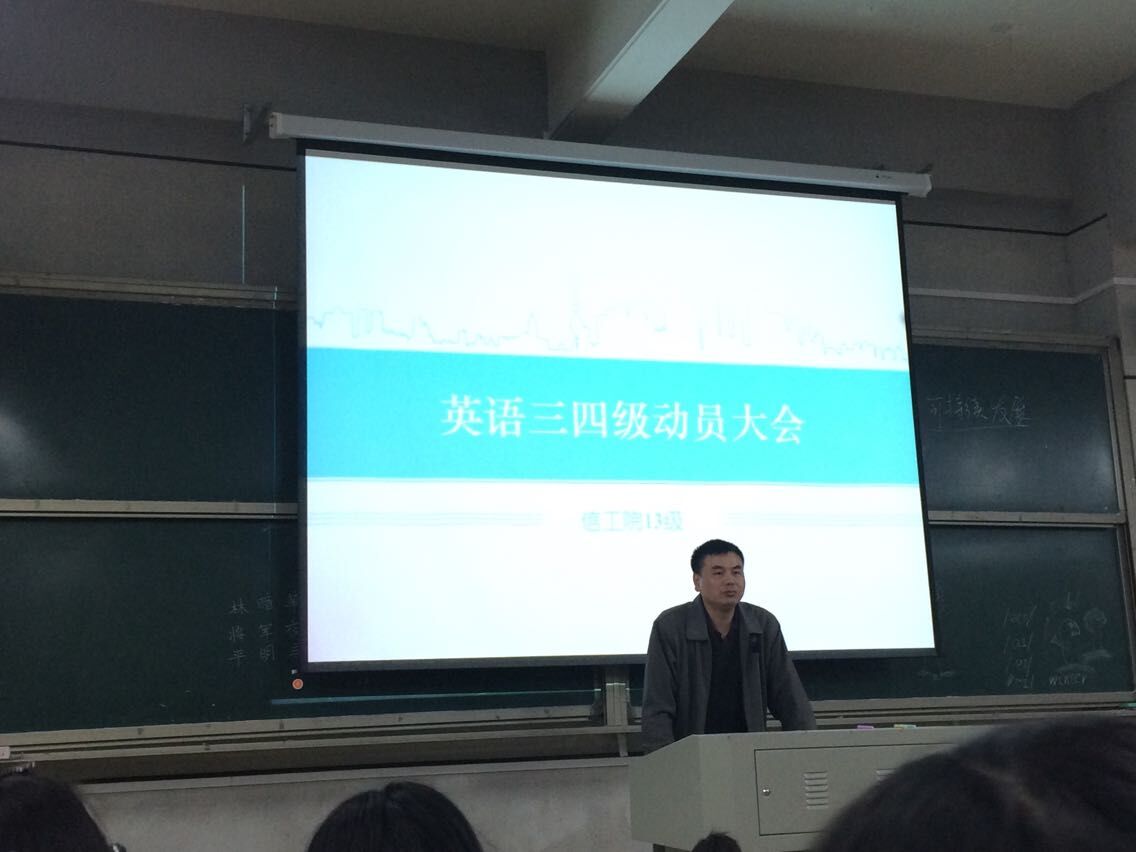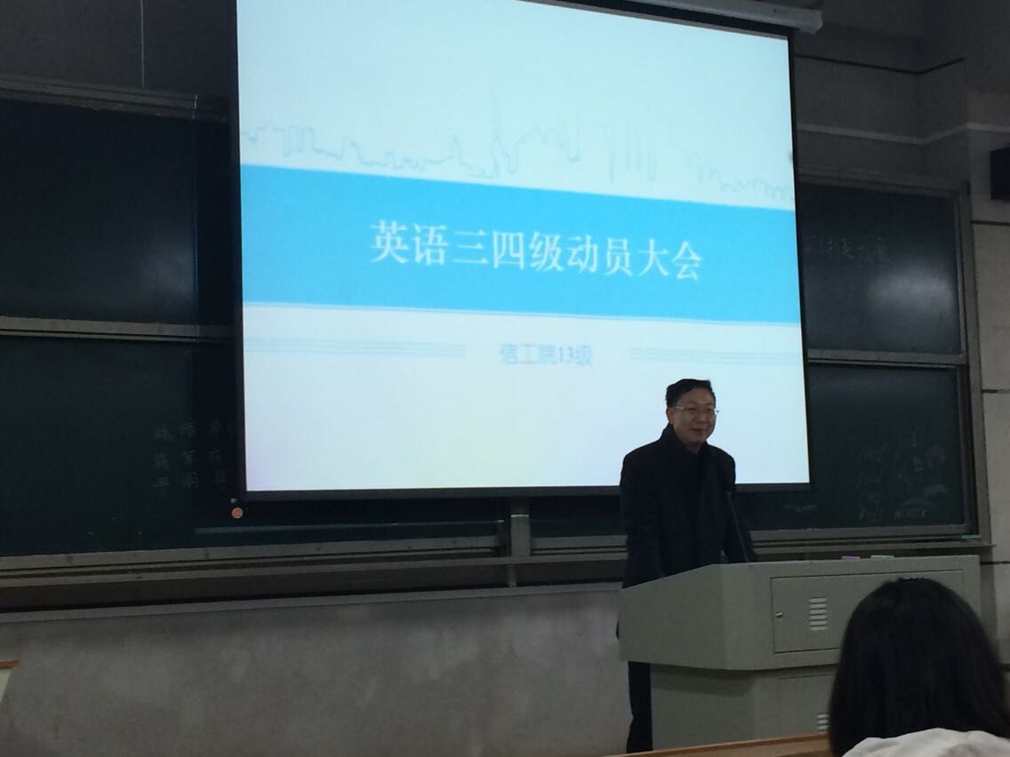 学生的英语学习信心,2015年4月6日晚6点30分,信息科学与工程学院于文科楼108教室开展英语三四级动员大会。院党总支书记王杰文教授、院长助理王建军博士应邀出席本次动员大会。参加的人员为12级学生代表孙小涵及13级全体学生。本次英语三四级考试动员大会由学工办老师关红儒主持。