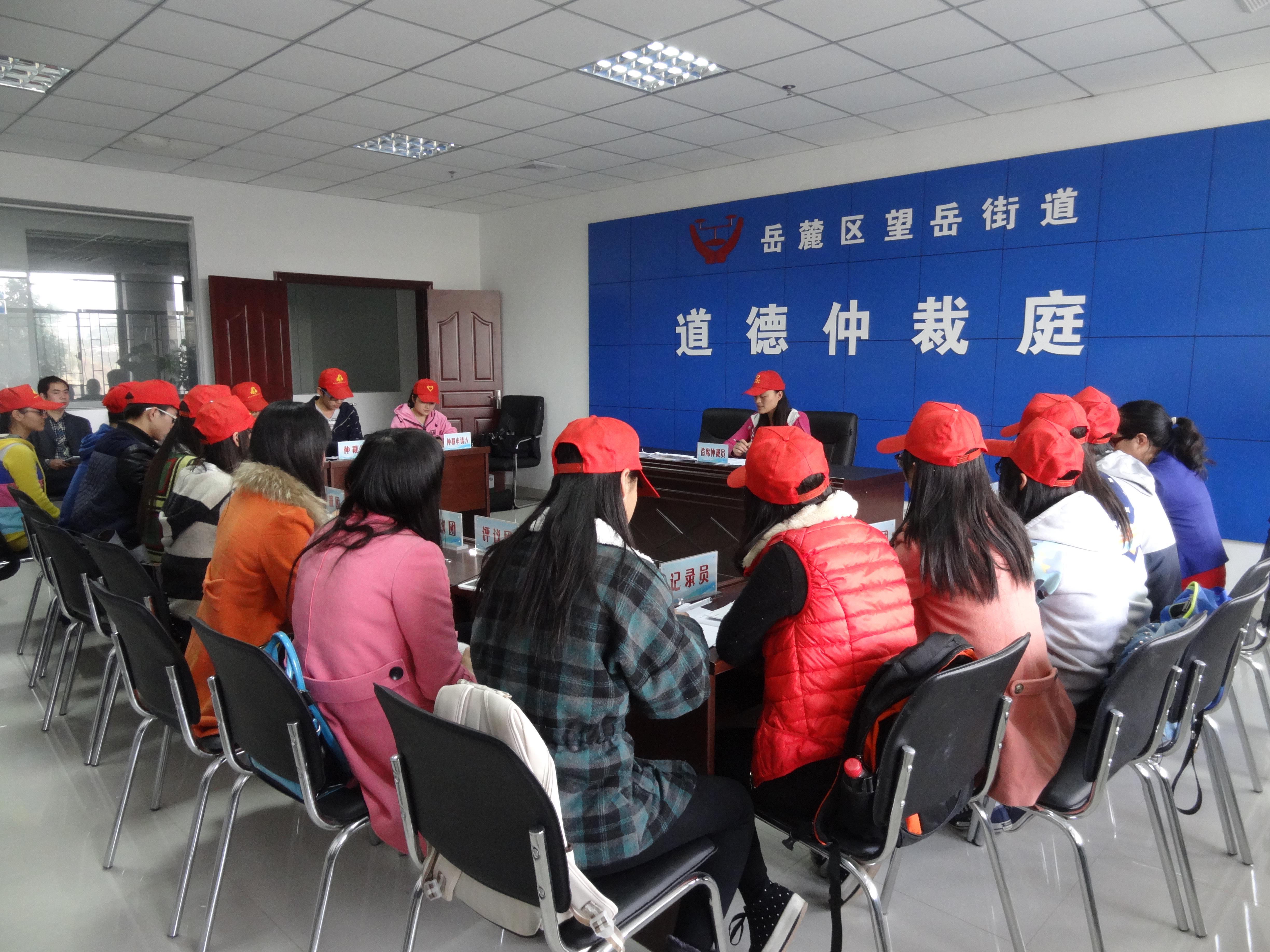 团总支青志协志愿者在望岳街道办事处恒华群众工作站,组织进行“道德仲裁庭”开庭活动。