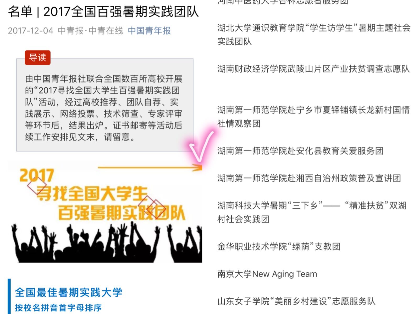 三下乡团队“赴安化县‘重走主席游学路’教育关爱服务团”荣获“全国大中专学生志愿者暑期‘三下乡’社会实践活动优秀实践团队”。在中国青年报社联合全国数百所高校开展的“2017寻找全国大学生百强暑期实践团队”活动中,午夜av