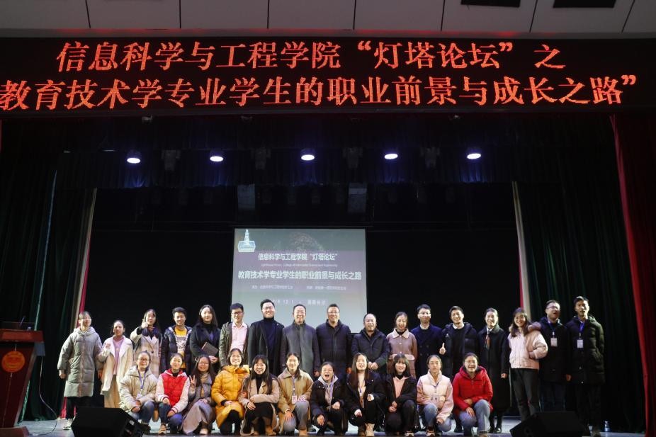于特立楼实验剧场举行分享报告会。校友会廖跃华老师、学院党总支书记王杰文教授、副院长田祖伟教授、党总支副书记成夏炎老师、学工办主任关红儒老师出席此次分享报告会。校友嘉宾文豪、于飞克、唐蓉琪、易青山、唐琬晴、曹向荣、学院17—19级教育技术学专业学生共计378人参加会议。会中,分享环节种六位校友分别作有关教育技术学的职业前景及自身经历的分享。文豪校友“用最初的心,走最远的路”;于飞克校友“唯有见识让你登高,唯有坚持才能抵达”;唐婉晴校友“一线教师的心路历程与方向”;唐蓉琪校友“教育技术专业在面临专业转型时应该如何应对”;曹向荣校友“关于教育技术学专业毕业生的定位”易青山校友“提高职业竞争力”为我们带来一场饱含激情与满满的干货的分享会。