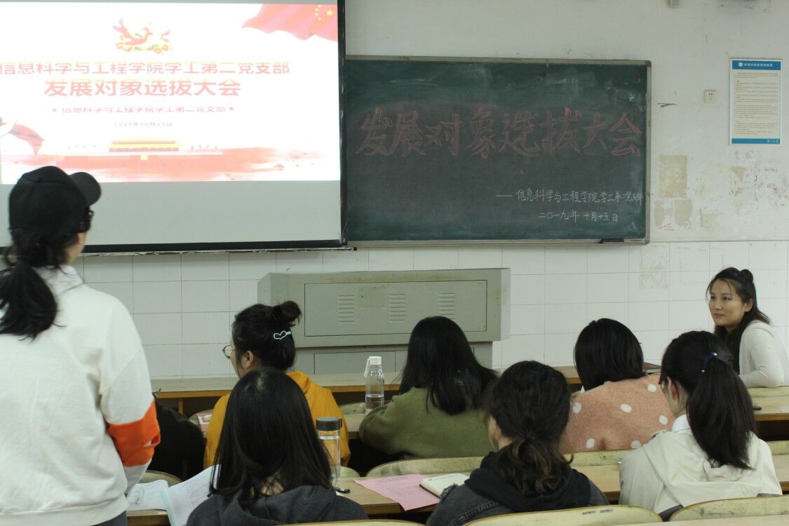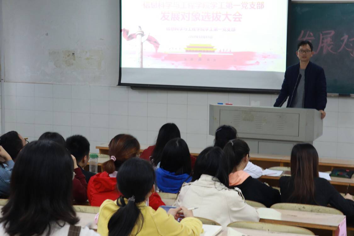党组织对优秀人才的选拔工作,深入了解积极分子的思想动态,10月15日下午,信息科学与工程学院学工第一党支部、第二党支部于玉衡楼北栋507、508顺利召开发展对象选拔大会。学工第一党支部书记关红儒同志、学工第二党支部书记唐瑞鸿同志、部分学生党员及33名入党积极分子参加此次会议。