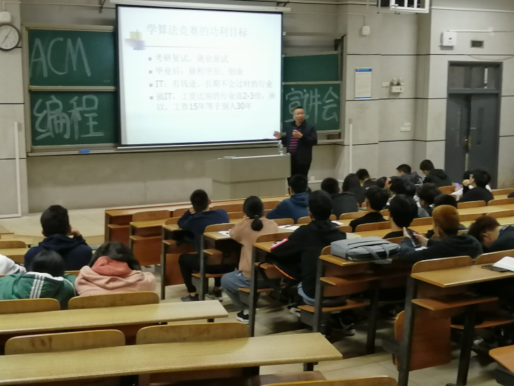 会上,田祖伟教授分别从赛事构成、组队要求、比赛规则、知识储备、解题步骤以及评分细节六个方面进行了细致讲解。他指出ACM程序设计竞赛是对编程能力、算法能力、分析问题能力以及团队合作能力的综合考查,同时表示欢迎各院对程序设计充满兴趣的同学前来学习,学院会通过对参赛学生进行定期培训、初试选拔及强化训练来有效提高同学们的设计与创新能力。