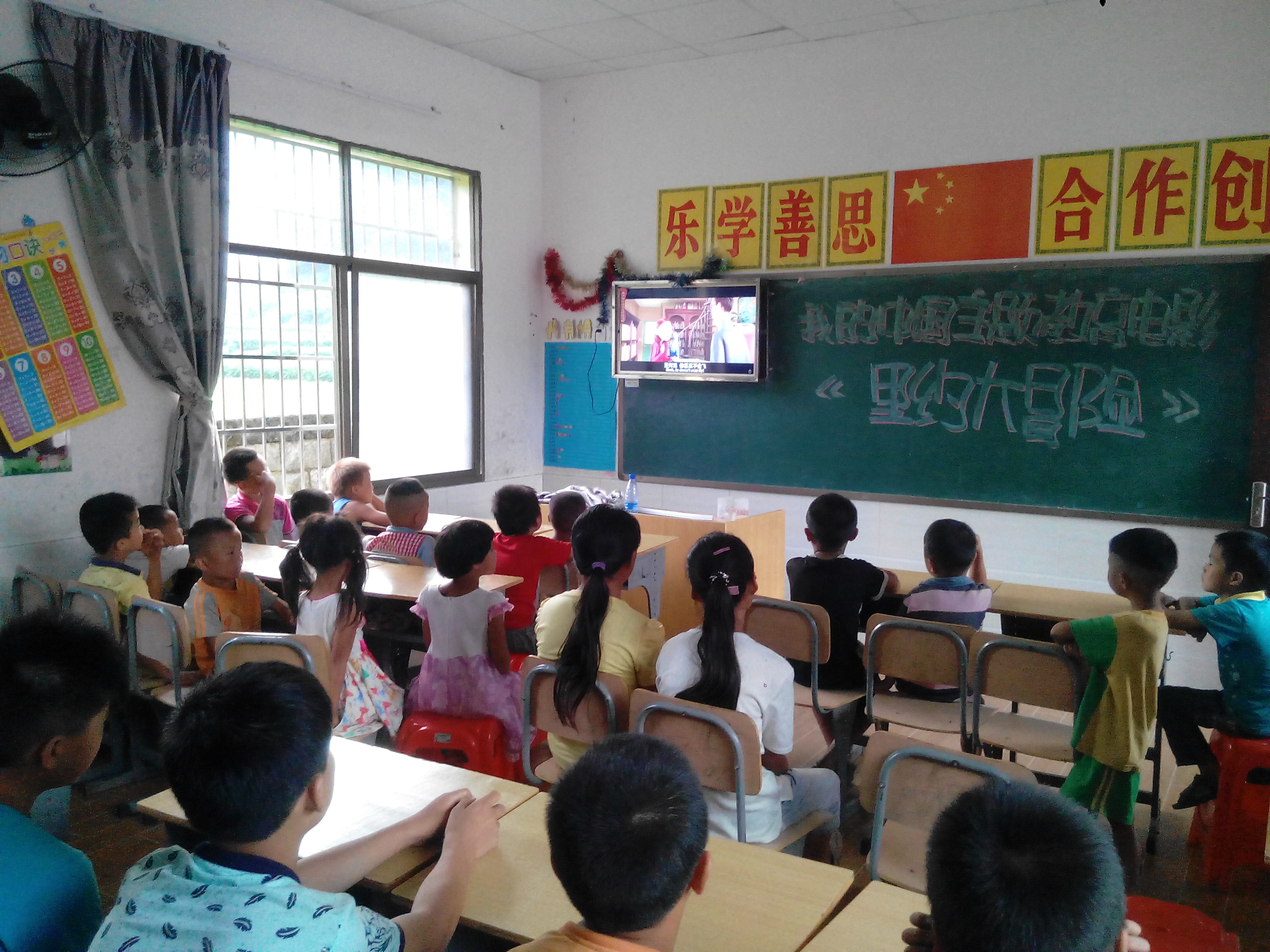 热闹的广场舞的另一边村里的学生们正在一年级教室津津有味的欣赏着我的中国梦主题教育电影《里约大冒险》通过有趣的动画和丰富的剧情将坚强勇敢的精神品质潜入学生的脑中。教室里频频传来学生欢乐的笑声,电影结束后学生团团围住负责播放电影的志愿者急切的询问明天播放的电影是什么。