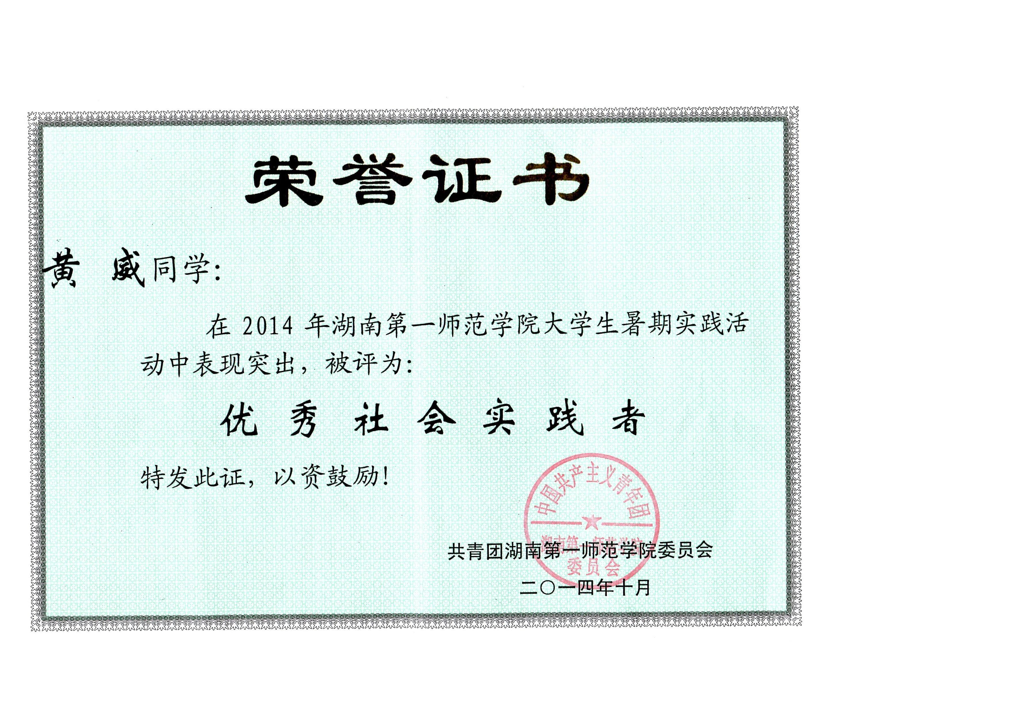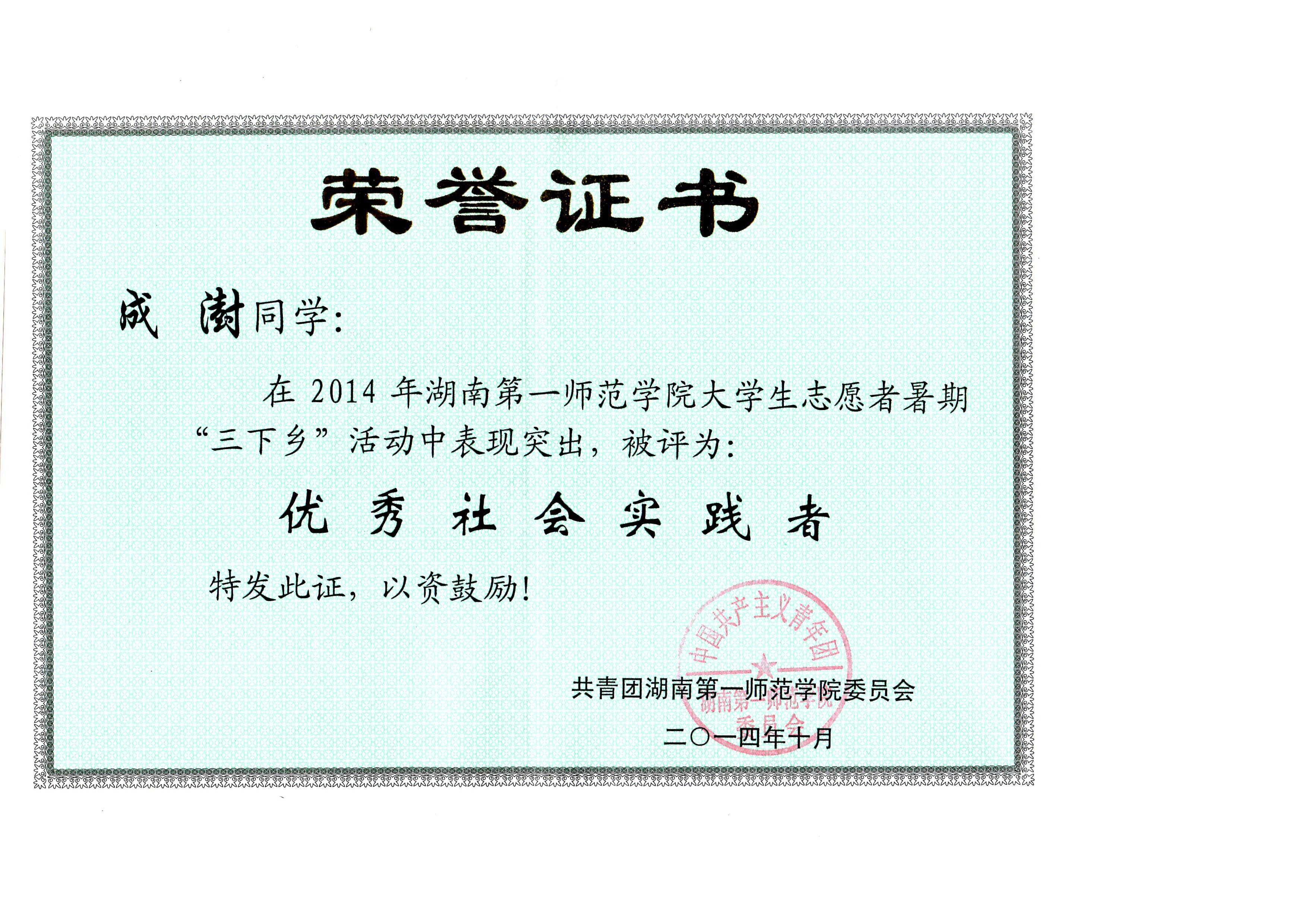 黄浩、刘智、曾玉娇、罗霞、赵淑英、金林源、李晓曼、曹向荣、李佳、林锦超、成澍、刘石奇、张晓敏、匡娜共计14人获得“大学生暑假‘三下乡’优秀社会实践者”称号,吴春秋、李洁、曹昕、黄威、叶果、刘钊、向立华、王烁共计8人获得“暑假社会实践优秀个人”称号。