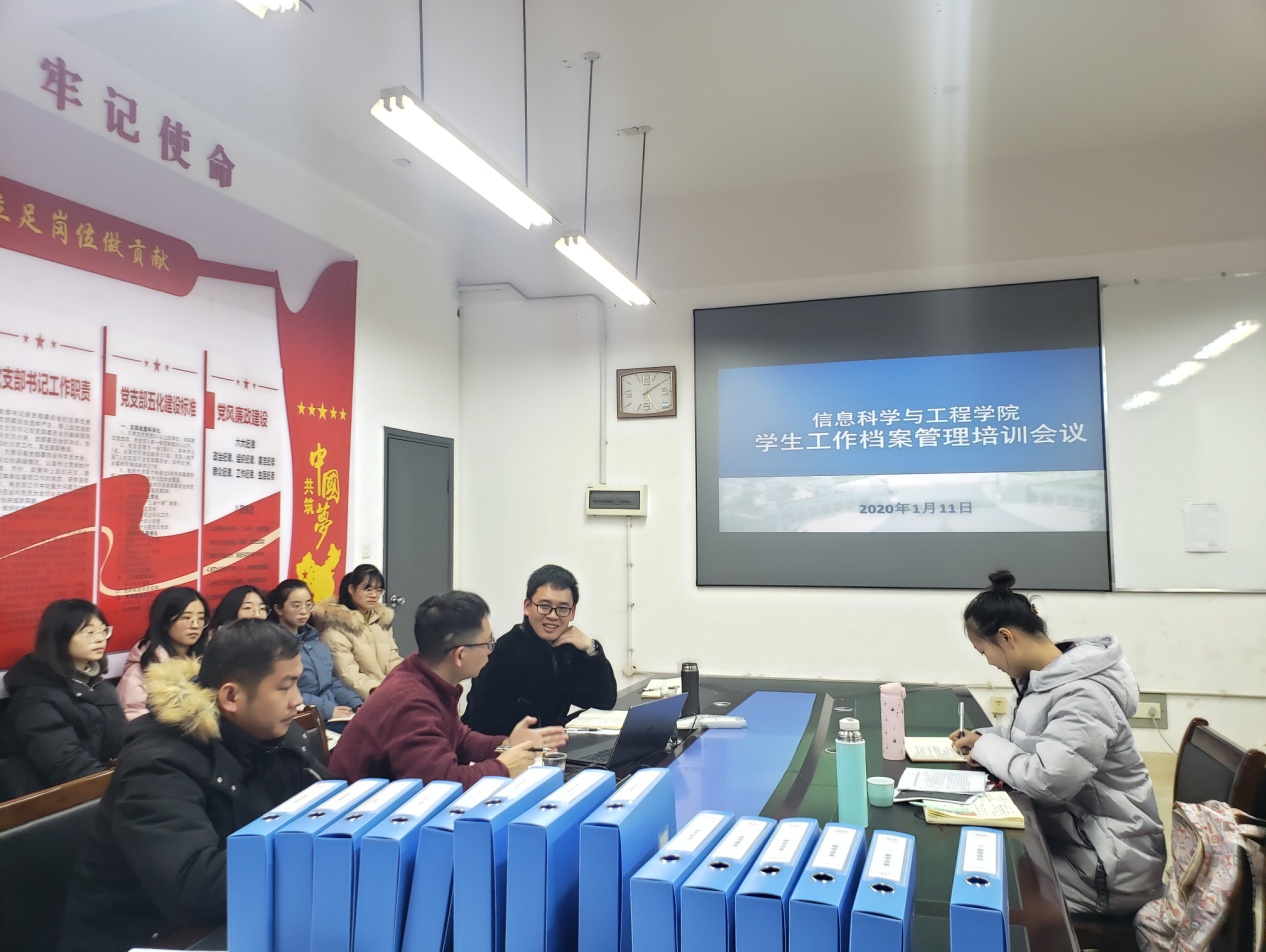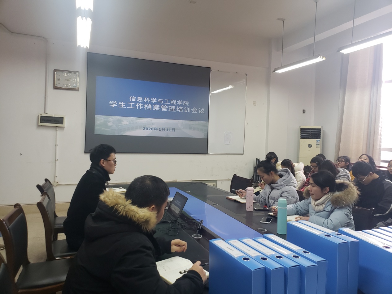 在学院会议室召开学生工作档案管理培训会。学院党总支副书记成夏炎授课,学工办辅导员老师以及主要学生干部、干事参加培训,会议由叶晶主持。