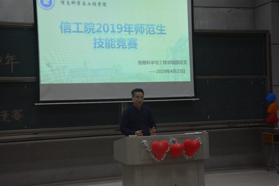 师范专业学生的教师职业技能,提高师范生教育教学能力,进一步促使广大同学更新教育理念和激发其掌握现代教学方法的热情,信息科学与工程学院于2019年4月16日—4月23日成功举办2019年师范生教师技能竞赛。并于4月23日下午6:30—22:00在润寰南106进行了现场授课决赛。学院副院长田祖伟教授、党总支副书记易利老师、学工办主任关鸿儒老师及学院教师代表阳西述教授、何昭青教授、何向阳教授、黄悦副教授和刘琳老师出席比赛并担任评委。