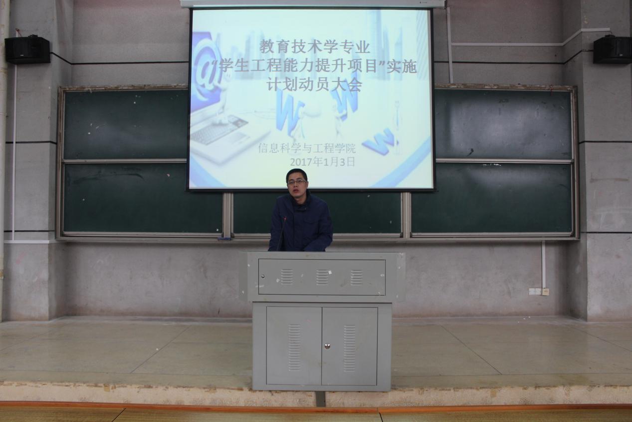 (通讯员赵越袁思思) 为配合学院“学风建设工程”与“技术精英竞赛季”工作,进一步培养教育技术学专业学生的学习兴趣专业动手能力,确保培养人才质量,实现打造“技术精英”的办学目标。2017年1月3日中午12点,信息科学与工程学院在文科楼报告厅召开了教育技术学专业“学生工程能力提升项目”实施计划动员大会。校长助理、信息科学与工程学院院长李勇帆,副院长田祖伟、王建军,党总支副书记罗祥云,教育技术学教研室何向阳博士及信工院教育技术学专业全体学生参加此次会议。大会由学工办李豪杰老师主持。
