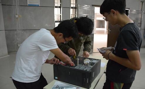 随后,进入硬件组装环节,每轮由三支参赛队伍同时进行硬件组装,并由老师针对选手们的表现进行评分。选手们积极投入比赛,全神贯注的眼神、认真细致的操作充分展示了信工人扎实的专业知识与专业技能。