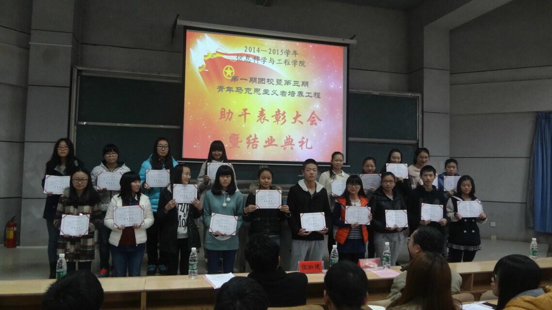(通讯员 丁青 肖亚丽 易利) 2014年11月25日12点30分,信息科学与工程学院第一期团校暨第三期青年马克思主义培养工程助干表彰大会暨结业典礼于理科楼报告厅(一)隆重举行。信工院党总支书记王杰文、院党总支副书记张如健应邀出席本次结业典礼,2014-2015届学生干部代表以及100余名助理干事参加了本次典礼。本次典礼由团总支书记易利主持。