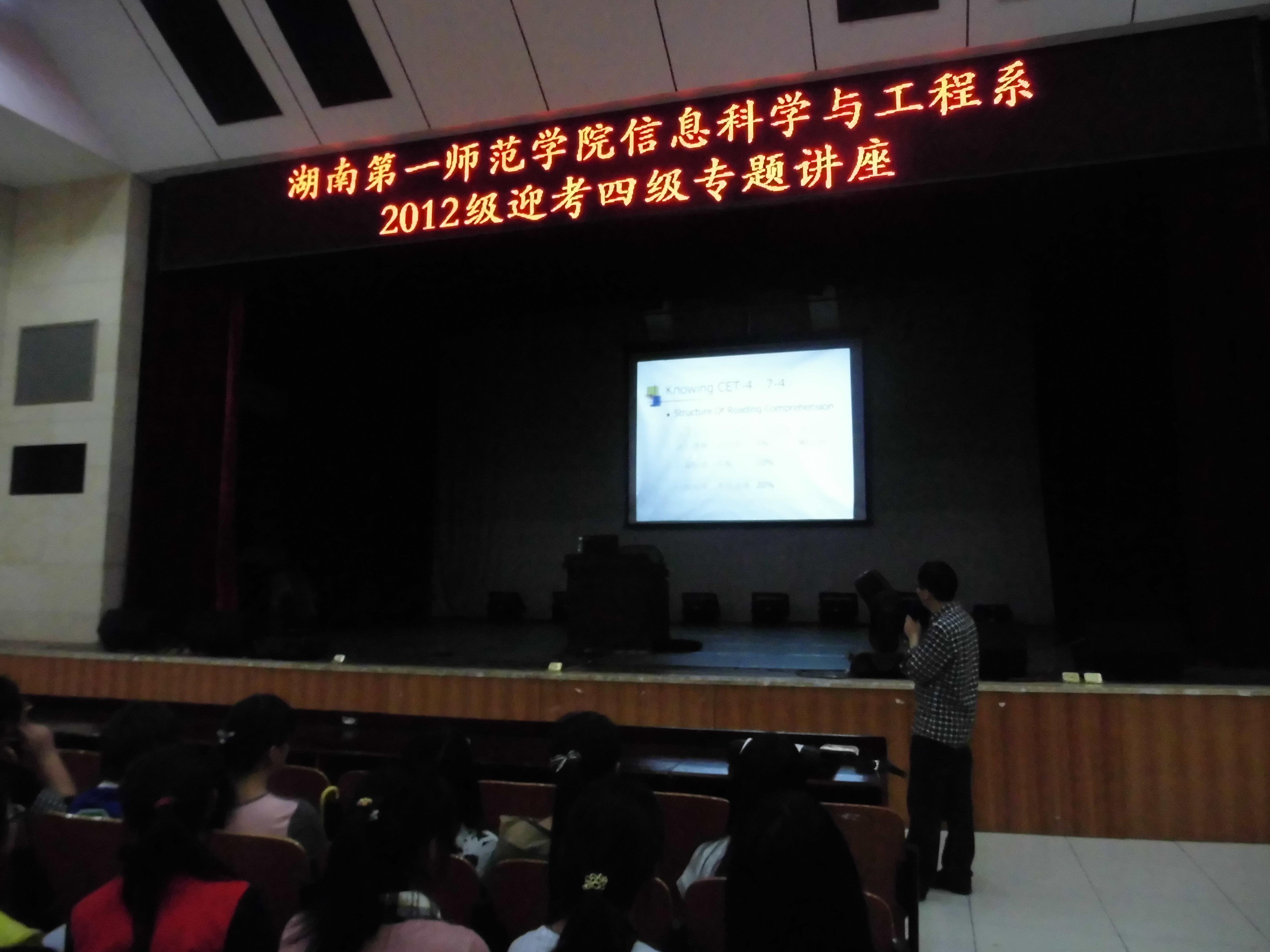 (通讯员 文晶 易利)4月10日,公共外语教学部刘明东教授应信息科学与工程系邀请,在晚上七点于科技楼演播厅隆重举办了一场主题为“信息科学与工程系2012级迎考四级”的专题讲座。信息科学与工程学系主任王杰文、团总支书记易利以及全体2012级学生共同参与了此次讲座。