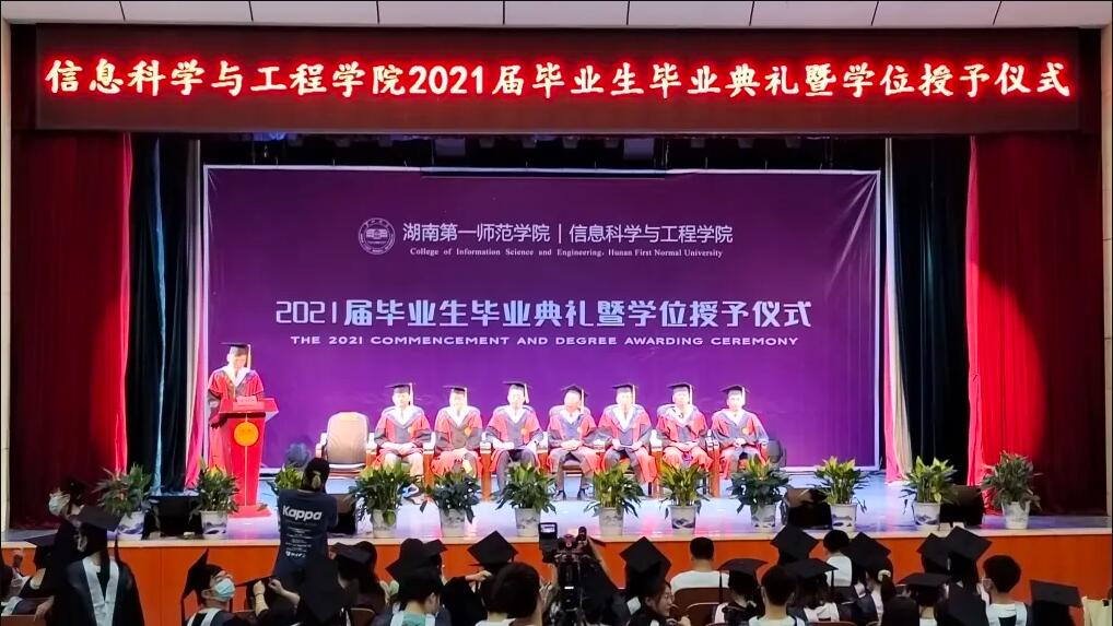8时57分,现场人员全体起立,在热烈的掌声和激昂的校歌声中,学院领导及教授代表进入会场并入座。9时许,全体人员庄严肃立,高唱国歌,信息科学与工程学院2021届毕业生毕业典礼暨学位授予仪式正式拉开序幕。