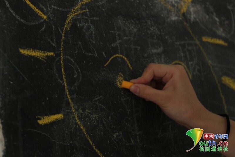 图为队员在画黑板报时手绘的“朝阳”。中国青年网通讯员 欧阳健 摄