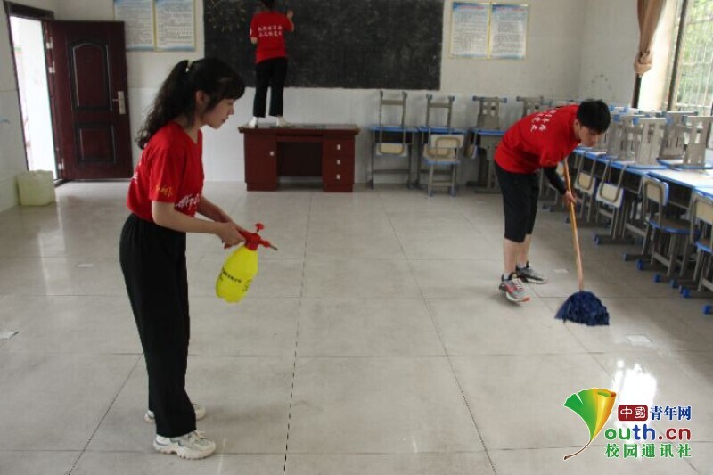 图为队员们正在对教室进行消毒与清洁。中国青年网通讯员 欧阳健 摄