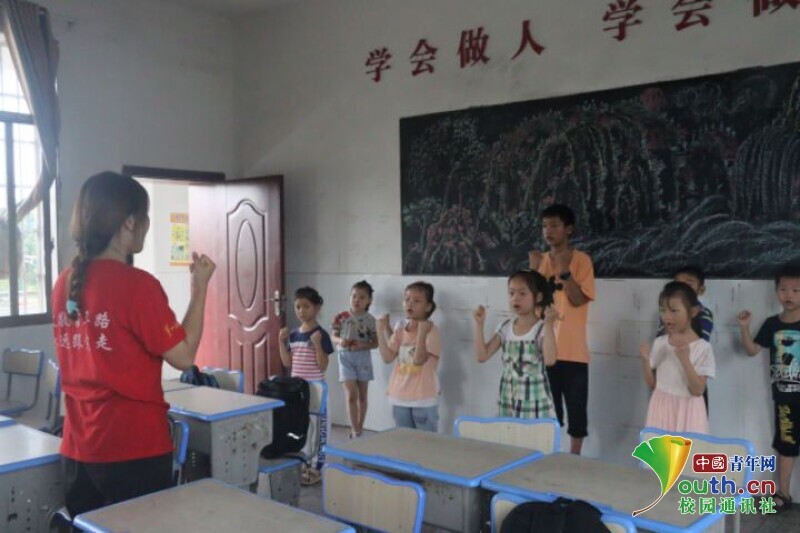 图为老师带着孩子们学习防溺水手语舞。中国青年网通讯员 欧阳健 摄