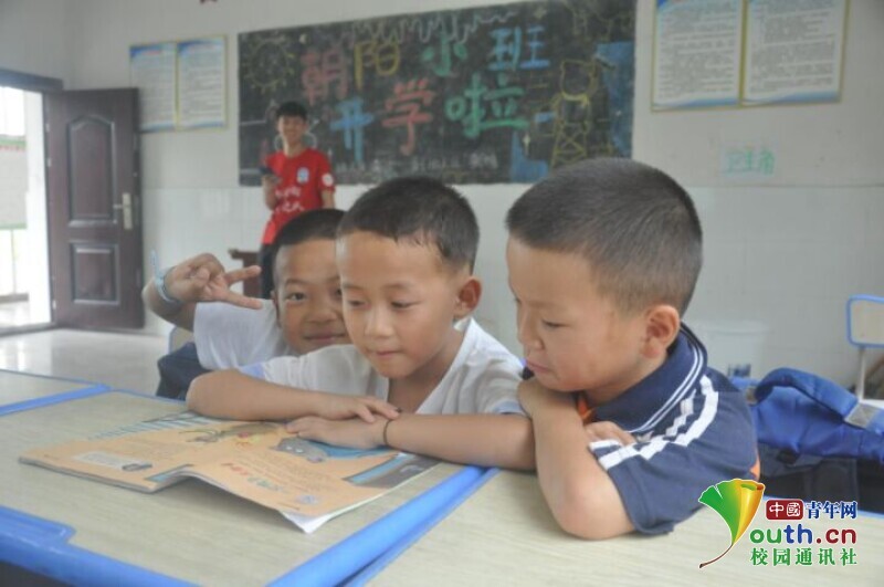 图为下课后孩子们围坐在一起阅读英语绘本,一名孩子兴奋地向老师打招呼。中国青年网通讯员 马唯一 摄
