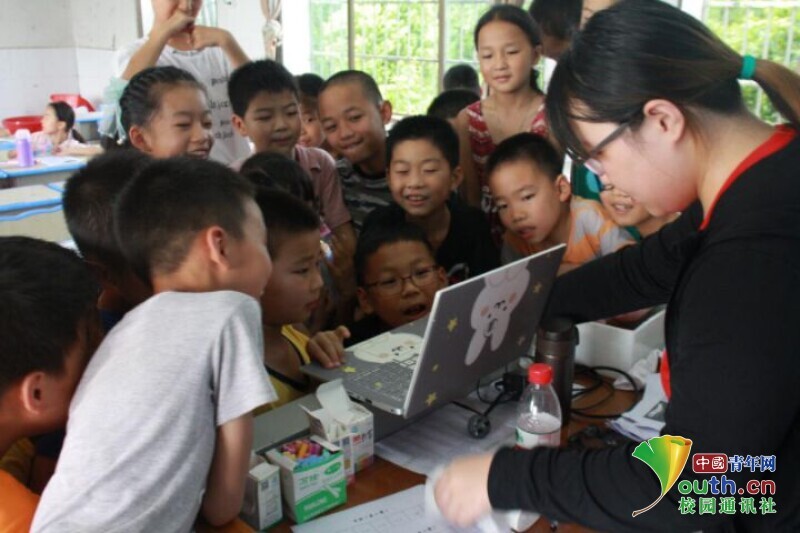 图为英语课下课后,老师给孩子播放英语趣味视频,孩子们都兴奋地凑上前观看。中国青年网通讯员 马唯一