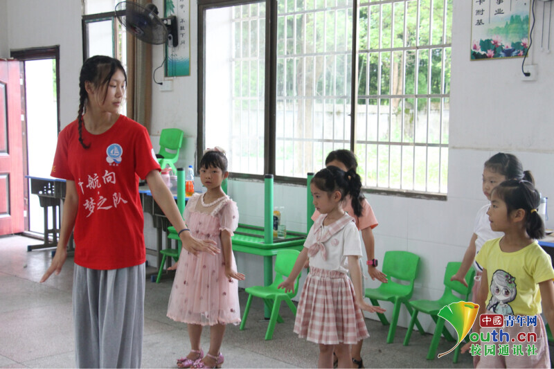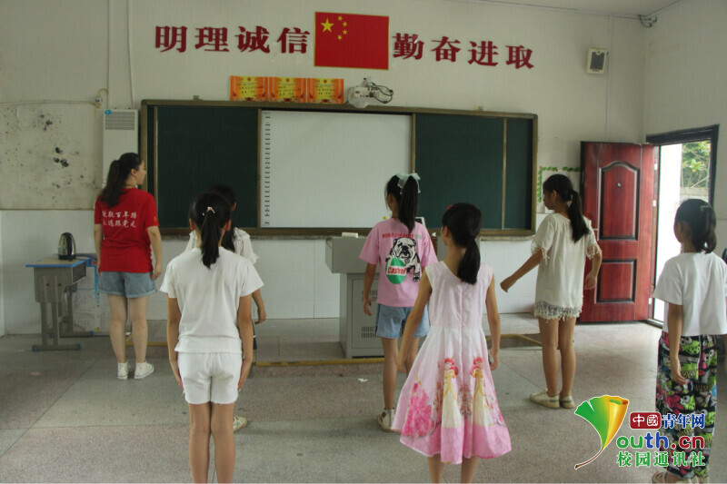 图为志愿者老师正在教学生们练习舞蹈《听我说》,听我说,粮食最重要,千万别浪费。中国青年网通讯员 欧阳健 摄
