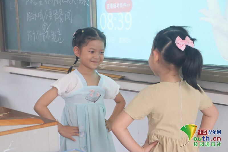 图为学生小爱和媛媛积极上台展示自己刚刚所学的舞蹈片段。中国青年网通讯员 马唯一 摄