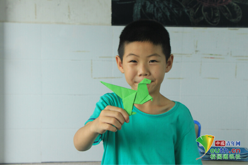 图为支教第七天的早上,提前到达教室的学生小林,给老师送上自己亲手折的恐龙。中国青年网通讯员 欧阳健 摄