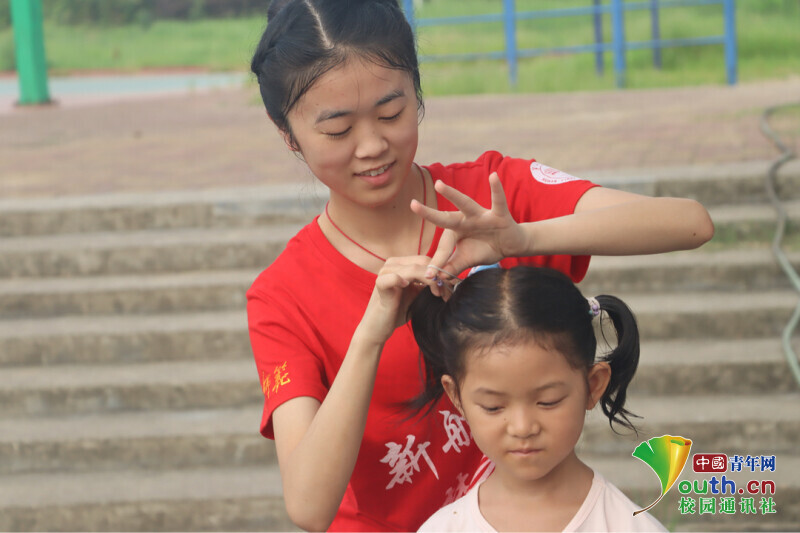 图为体育课上学生小爱的头发不小心松散,志愿者老师立马给扎起了双马尾,大汗淋漓。中国青年网通讯员 欧阳健 摄