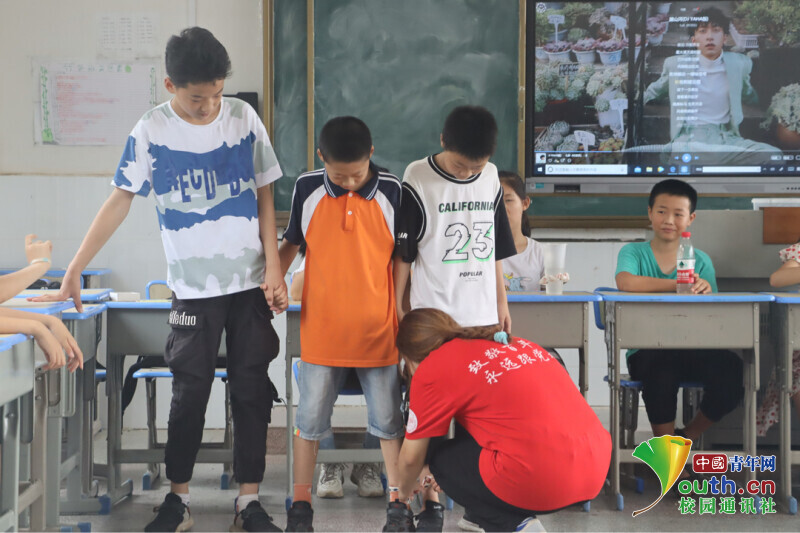 图为趣味英语课后,学生告知老师自己眼睛不舒服,志愿者老师耐心地询问原因,了解情况后,小心翼翼地为其滴眼药水。中国青年网通讯员 欧阳健 摄
