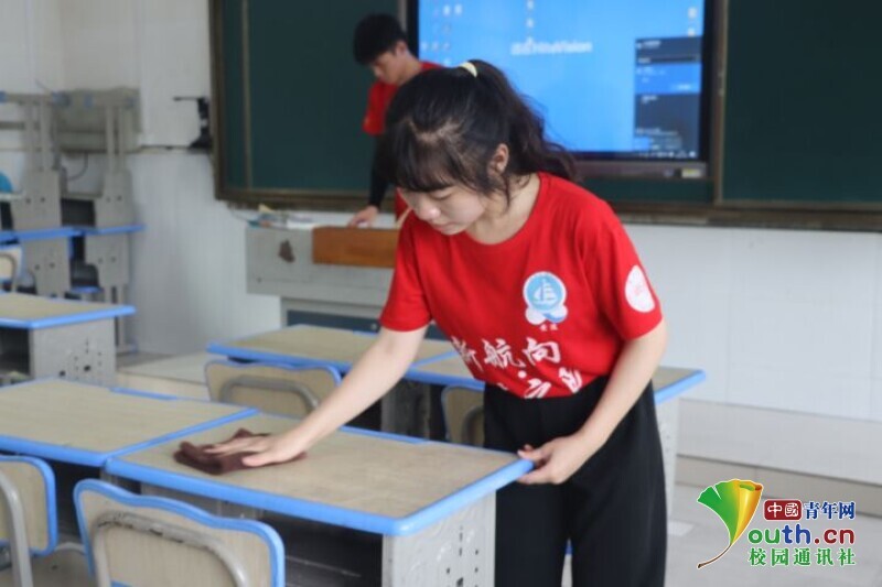图为队员用稀释过的“84”消毒液擦拭教室桌椅。中国青年网通讯员 欧阳健 摄
