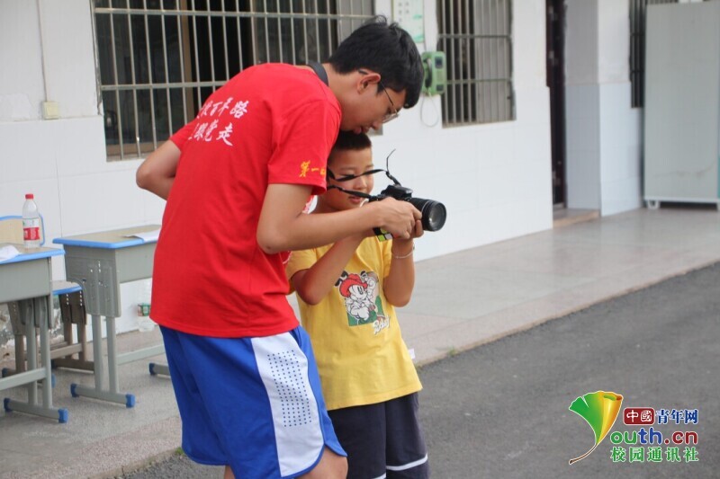 图为志愿者俯下身耐心地指导学生使用摄像机。中国青年网通讯员 段新利 摄