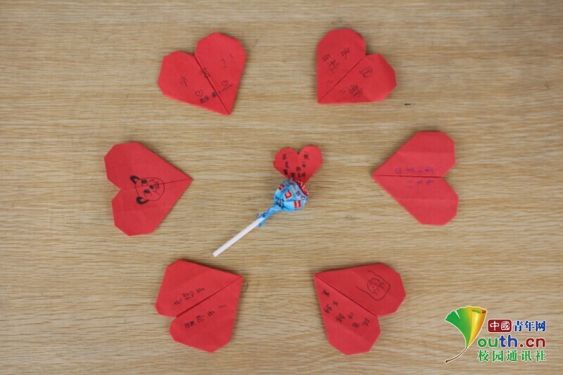 图为手工课中,孩子们在自己纸折的红色爱心上,写上对志愿者老师诚挚的祝福与浓浓的爱意。中国青年网通讯员 欧阳健 摄