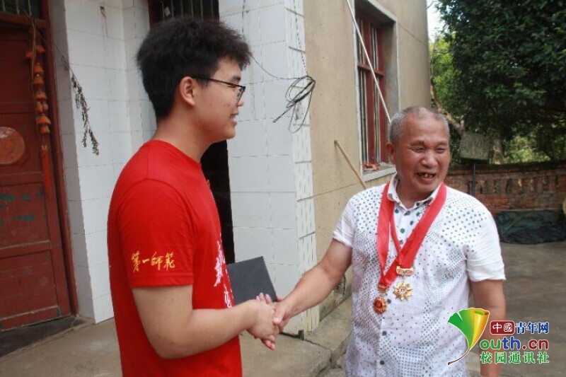 图为调研访谈中,受访的当地老党员夸赞来访的队员们并热情地与队员握手。 中国青年网通讯员 欧阳健 摄