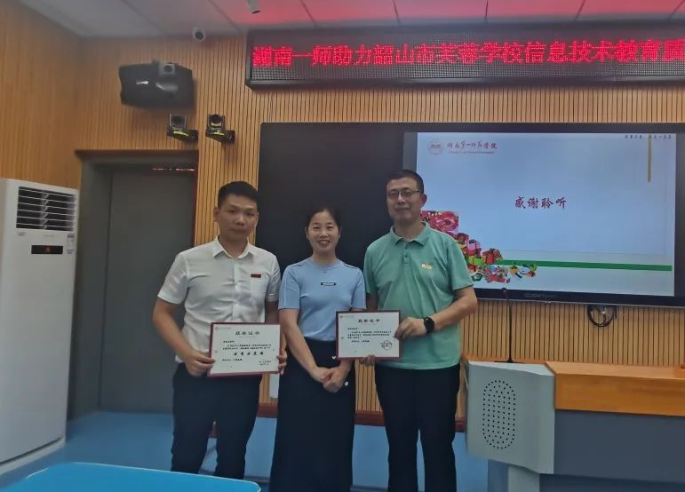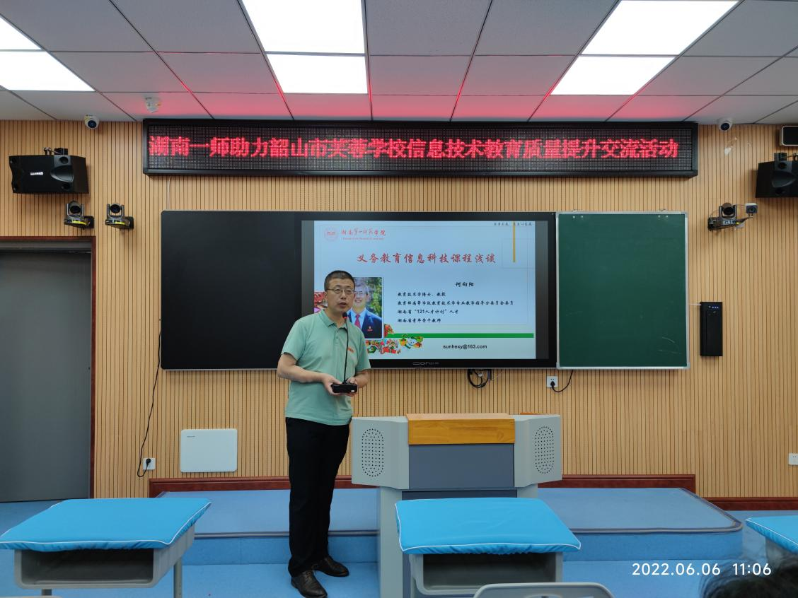 副院长何向阳带领由教育技术学专业教学论团队成员、长沙市天心区青园小学教师龚宣运、湖南一师第一附属小学教师曹向荣组成的教育技术学帮扶团队,前往韶山市芙蓉学校开展信息技术教育质量提升交流研讨活动。此次活动由韶山市芙蓉学校校长李冬文主持,芙蓉学校全体行政、综艺组全体教师,韶山市各小学信息技术教师代表等参加了此次活动。
