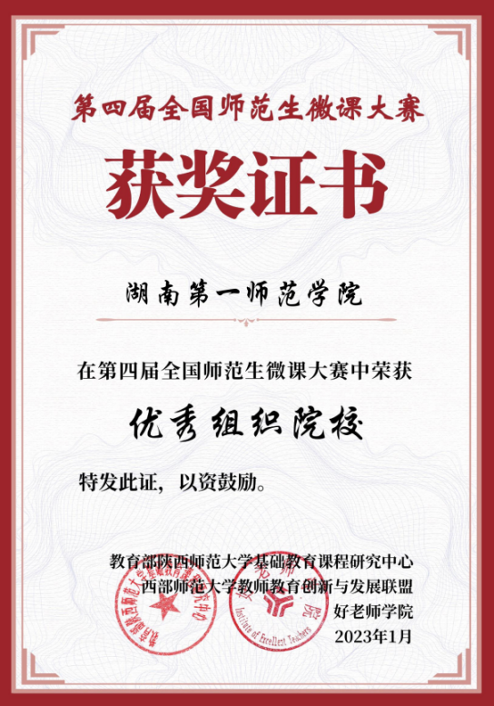2023116日,第届全国师范生微课大赛结果揭晓,我校组织选送的12项作品获奖,其中特等奖3项、一等奖2项、二等奖7项。校获评优秀组织院校刘琳、谷炽辉、张卓林老师被授予“优秀指导教师”荣誉称号。