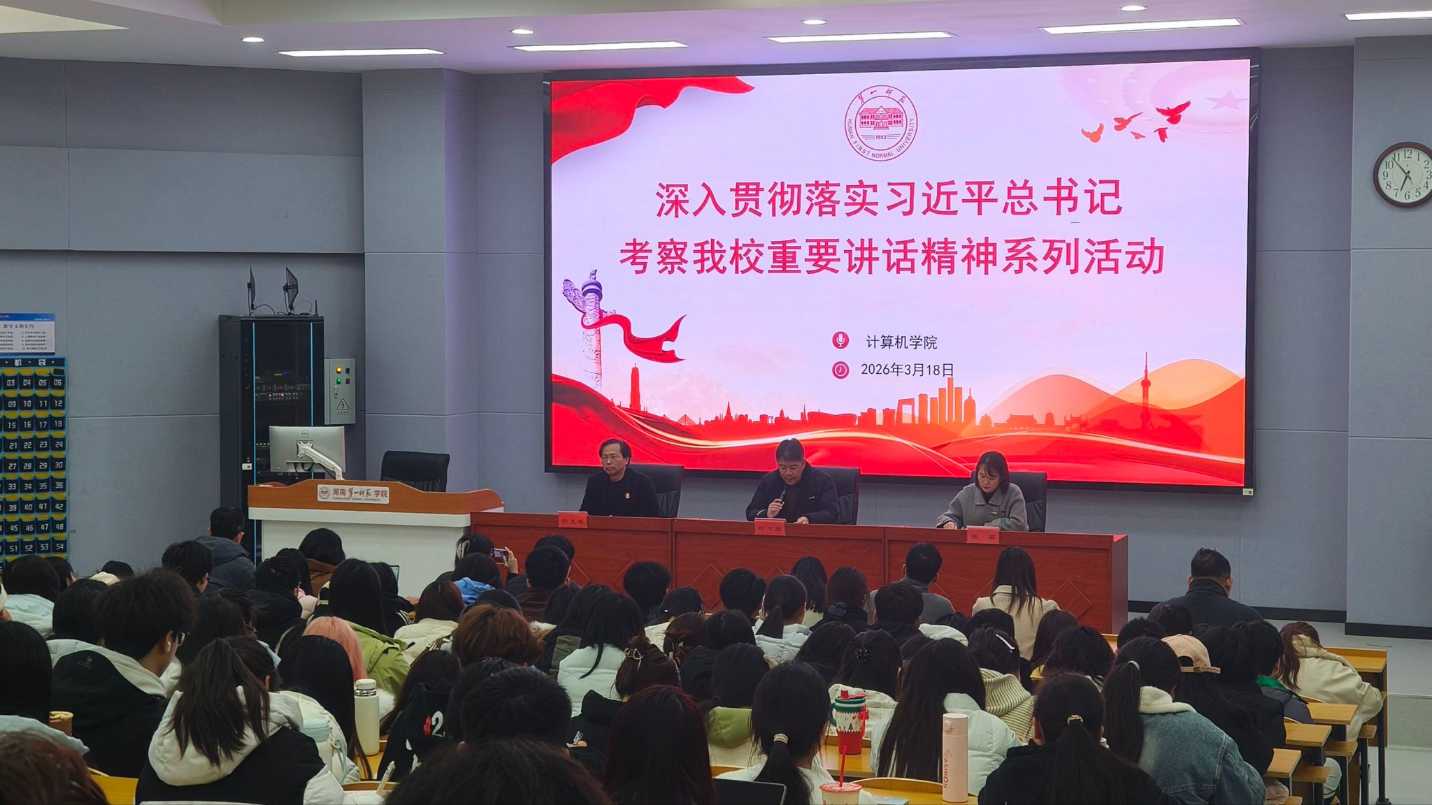 3月18日,我院在润寰楼105开展学习贯彻落实习近平总书记考察我校重要讲话精神主题活动,院党委书记刘大维、党委副书记陈奕、院专职组织员舒克斌、全体辅导员与200余名师生代表共同参加。