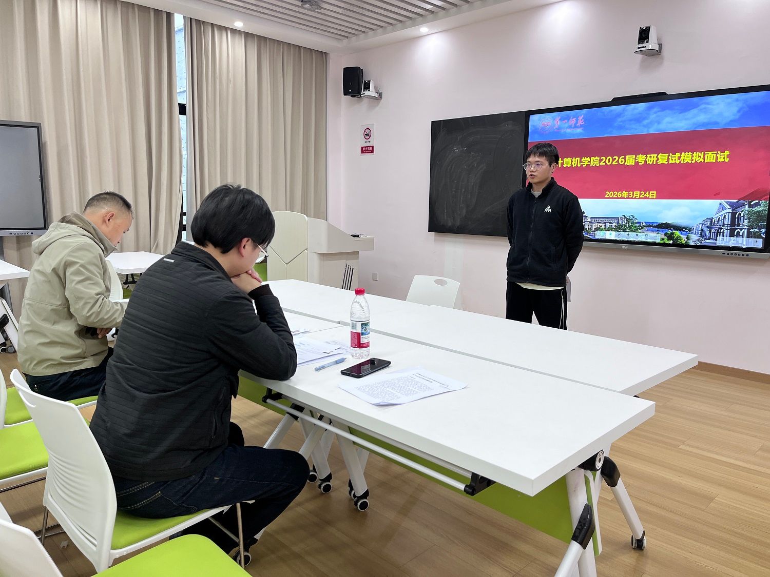 为将复试帮扶落到实处,切实提升学生实战能力,3月24日下午,学院在立园楼组织开展了考研模拟面试。活动模拟真实复试场景,分设两个考场同步进行。每位学生的模拟面试总时长约12分钟,流程包括中英文自我介绍、专业问答等环节,全面考察学生的语言表达、专业知识与临场应变能力。参与学生以饱满积极的状态投入演练,在实践中发现不足、优化策略,为正式复试奠定了扎实基础。