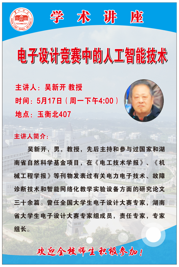 【学术讲座预告】 吴新开:电子设计竞赛中的人工智能技术