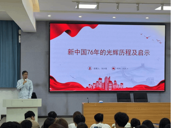 刘大维以“新中国七十六年的光辉历程及启示”为主题,通过详实的数据和生动的案例,生动展现了新中国76年来所创造的伟大奇迹。在回顾历史进程时,刘大维将76年细分为多个关键阶段:从新民主主义革命胜利后的百废待兴,到社会主义建设时期的艰辛探索;从改革开放春风吹遍神州大地,到新时代中国特色社会主义事业的蓬勃发展,每一个阶段都凝聚着无数中华儿女的拼搏与奉献。最后,刘大维总结强调,“历史是最好的教科书”,正是坚持中国共产党的领导,中国才能走过光辉历程,创造伟大奇迹。这启示我们,唯有不忘初心、砥砺前行,方能战胜一切艰难险阻。