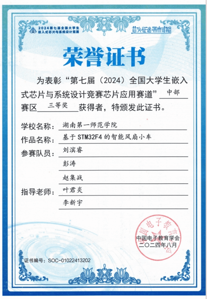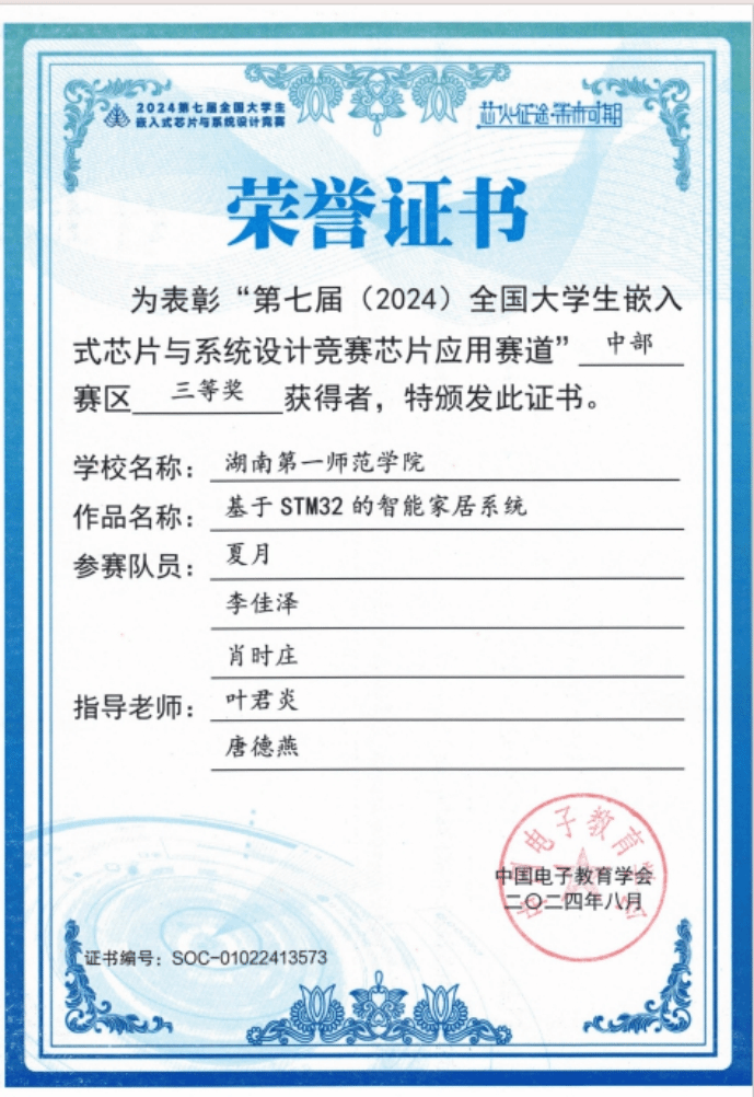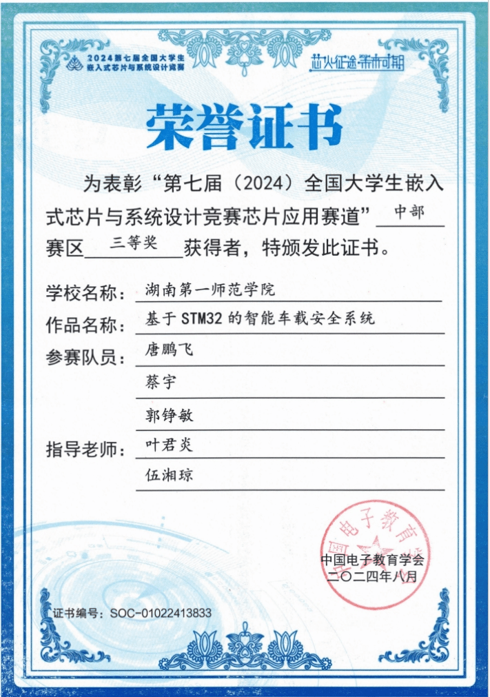 第七届(2024)全国大学生嵌入式芯片与系统设计竞赛圆满收官。该竞赛由中国电子学会主办、东南大学承办,是面向全国高校学生的权威赛事,已连续 4 年入选 “全国普通高校大学生竞赛排行榜”。此次比赛竞争激烈,午夜av 首次组队参赛,在指导老师叶君炎的精心指导下,参赛学生凭借扎实专业知识与拼搏精神,于中部赛区荣获三等奖 3 项。