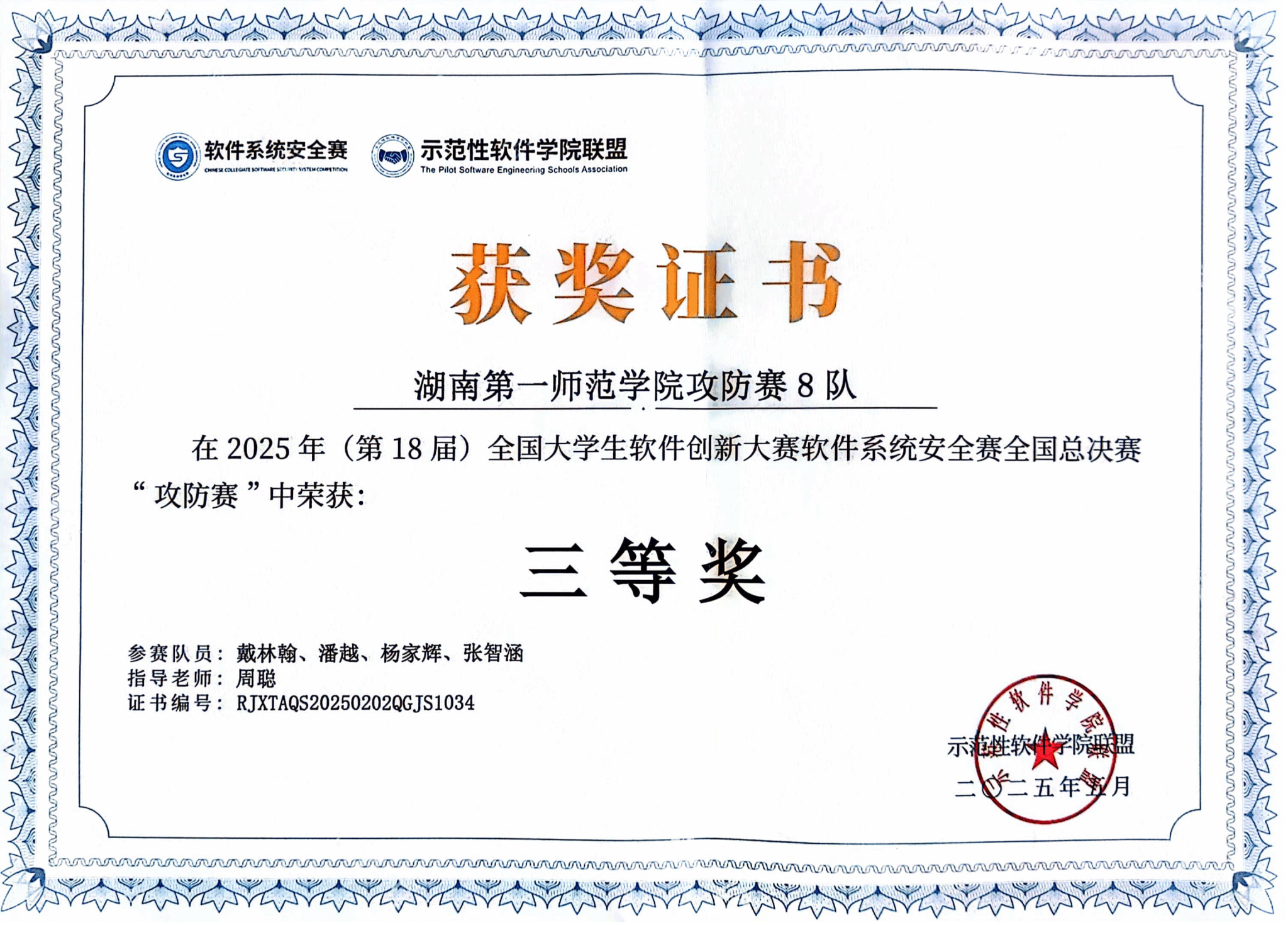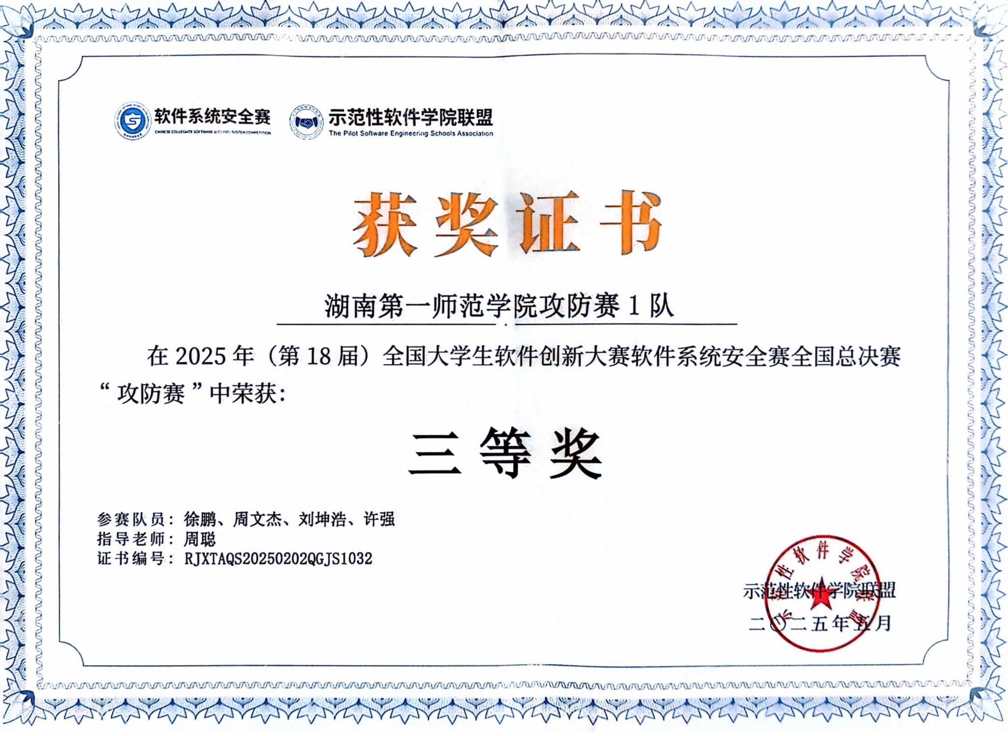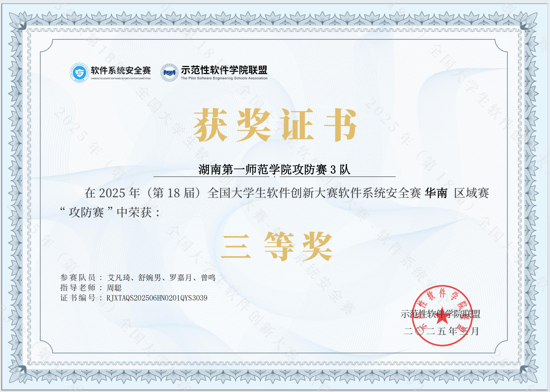 第18届全国大学生软件创新大赛软件系统安全赛全国总决赛于2025年5月18日在湖南大学圆满落幕。湖南高校共有18支团队获奖。其中我院的2支参赛团队荣获攻防赛三等奖,实现了网安竞赛团队在国家级赛事中获奖的突破。在区域赛阶段,午夜av