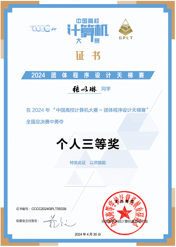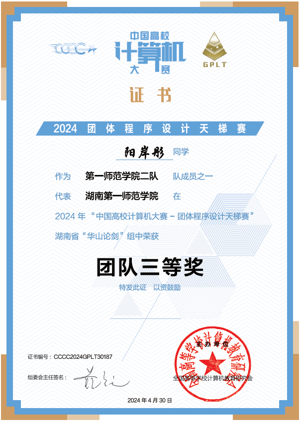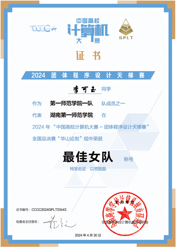 近日,第九届“中国高校计算机大赛-团体程序设计天梯赛(GPLT)”(以下简称“天梯赛”)成绩揭晓,代表队获得“华山论剑”组“最佳女队”国家奖唯一、国家级团队三等奖、省级团队三等奖和个人国家级三等奖好成绩全国高校排名217名。