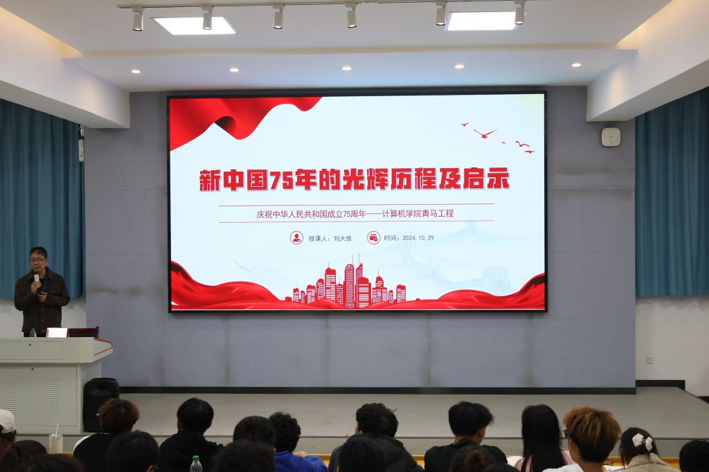 青马工程在玉衡南101教室正式开班,全体学生干部及2024级全体团学会实习干事齐聚一堂,迎来了青马工程开班第一课。本次课程由院党委副书记刘大维主讲,主题为“新中国75年的光辉历程及启示”。