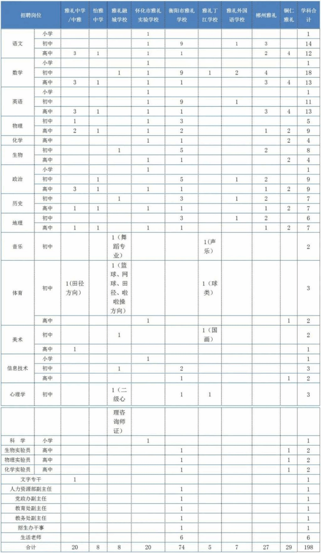3、怀化市雅礼实验学校招聘的小学科学老师以及衡阳市雅礼学校招聘的人力资源部副主任、党政办副主任、教育处副主任、教务处副主任、招生办干事、生活老师岗位:仅网络报名、收简历,届时再电话通知考核事宜。