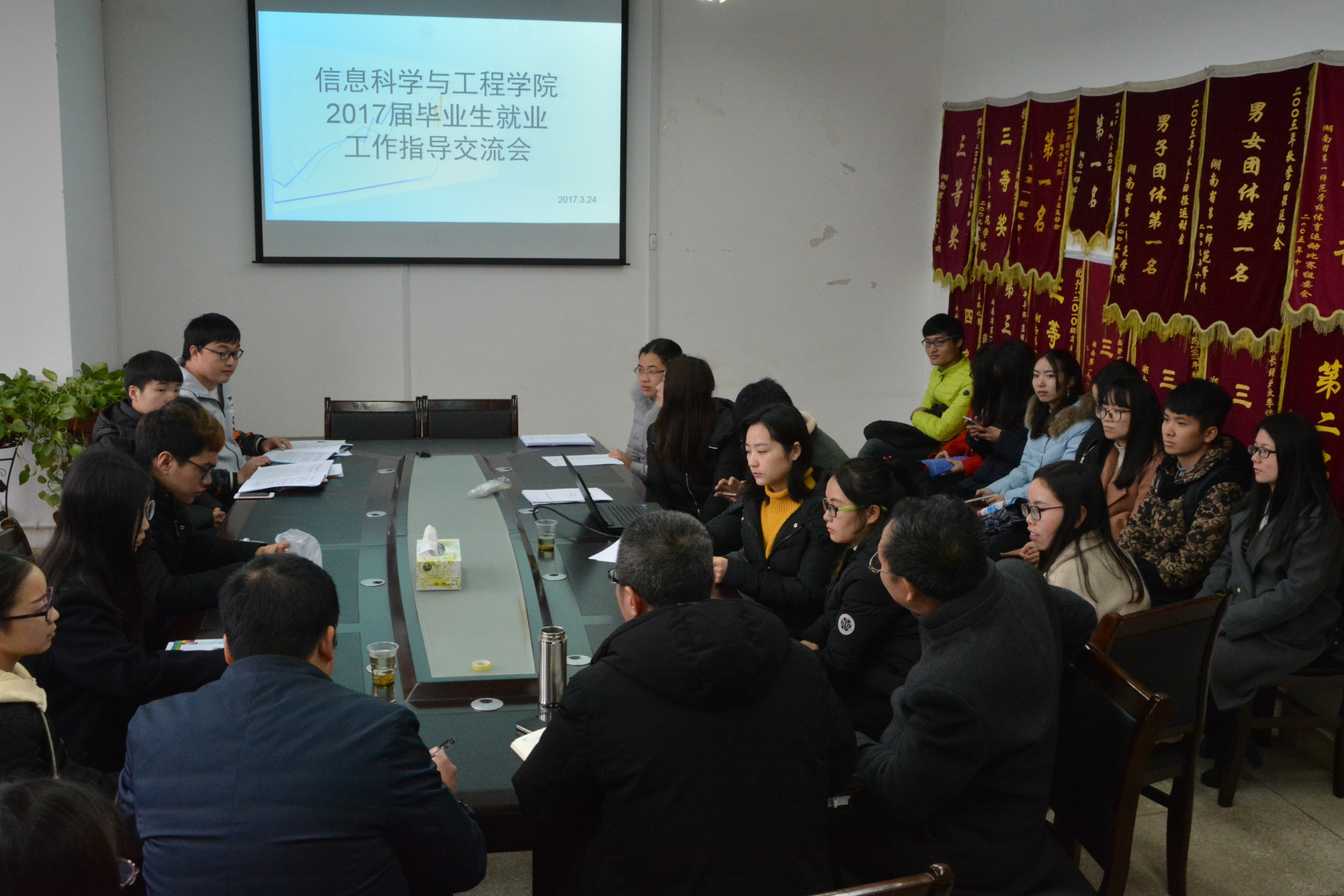 组织召开2017届毕业生就业工作指导交流会,院党总支书记王杰文、副书记罗祥云、副院长田祖伟出席会议,学工办老师及毕业生代表30余人参加了交流会。