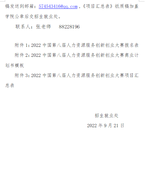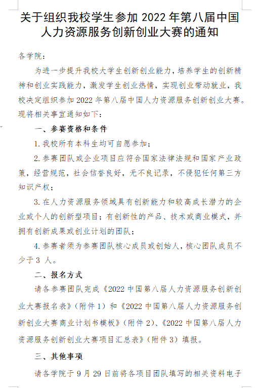 现将校创新创业学院《关于组织我校学生参加2022年第八届中国人力资源服务创新创业大赛的通知》转发,请按照文件要求,广泛宣传,积极动员学生参加大赛,具体参赛要求见附件。请各班实践委员于9月27日下午18:00前将推报材料(见附件1)纸质版、电子版以班级名称命名上交院创新创业与就业服务部杨同学(QQ:2084222961)。院创新创业与就业服务部于次日交至学院学工办(百熙楼127-5)。