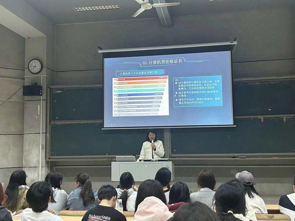 邱雪影指出,随着信息技术的迅速发展,计算机类专业已经成为了当今世界最具吸引力的就业领域之一。目前,计算机行业竞争日益加剧,技术不断更新,想要在这个行业立足,仅仅拥有学历远远不够,拥有专业的职业资格证书将为我们的简历增光添彩,成为脱颖而出的关键。她向同学们详细介绍了职业资格考试的具体细节,帮助学生更加深入的了解证书对未来职业发展的重要性。邱雪影强调,计算机类专业的发展势头不可阻挡,要想在这个激烈的竞争环境中脱颖而出,仅仅依靠学历是远远不够的。拥有专业的职业资格证书将为同学们的职业生涯打开新的大门,让同学们在激烈的竞争中脱颖而出。