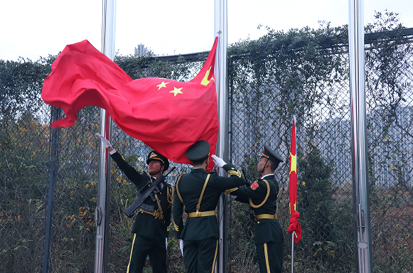在田径场隆重举行升旗仪式。国旗护卫队步伐威严铿锵、整齐划一,在全体师生的注目礼下,伴随着嘹亮的国歌声,徐徐升起鲜艳的五星红旗,迎风飘扬。
