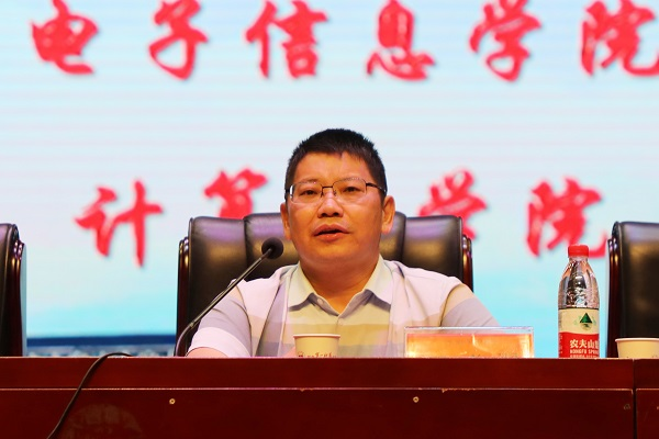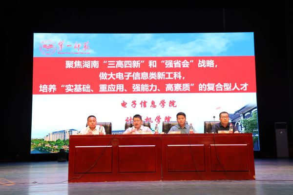 罗成翼以《聚焦湖南“三高四新”和“强省会战略”,做大电子信息类新工科,培养“实基础、重应用、强能力、高素质”的复合型人才》为题开讲入学教育第一课。
